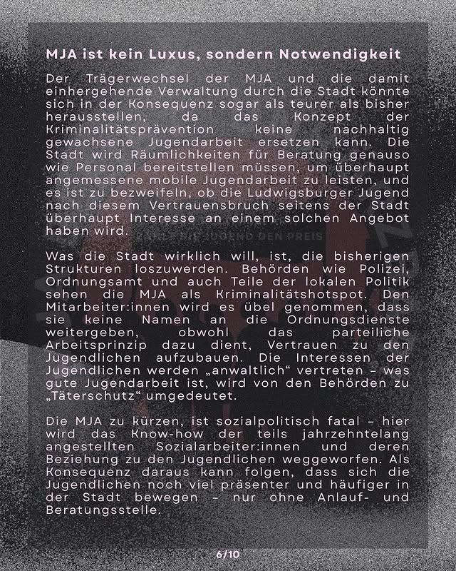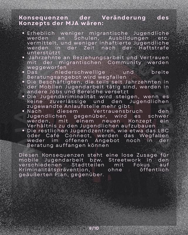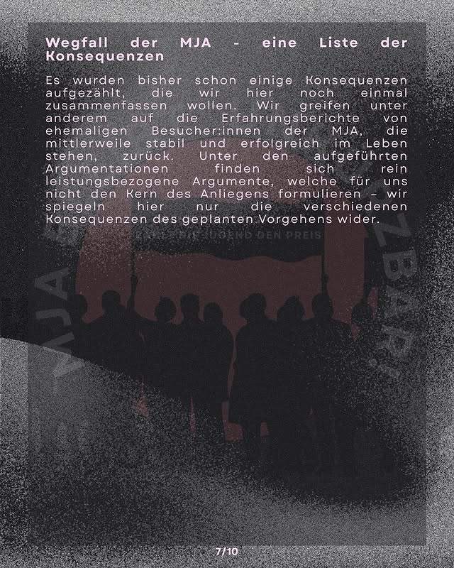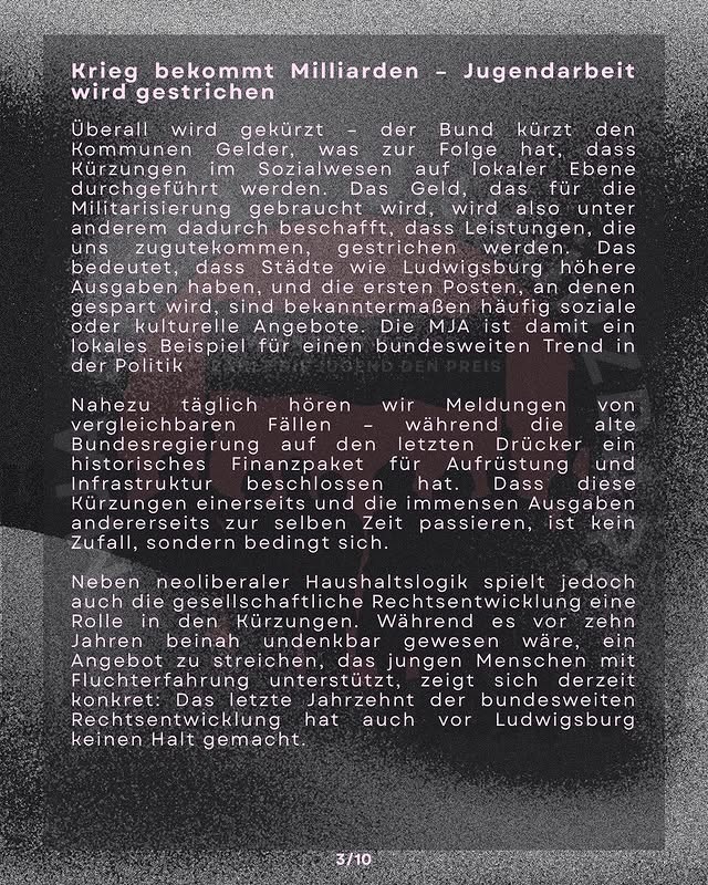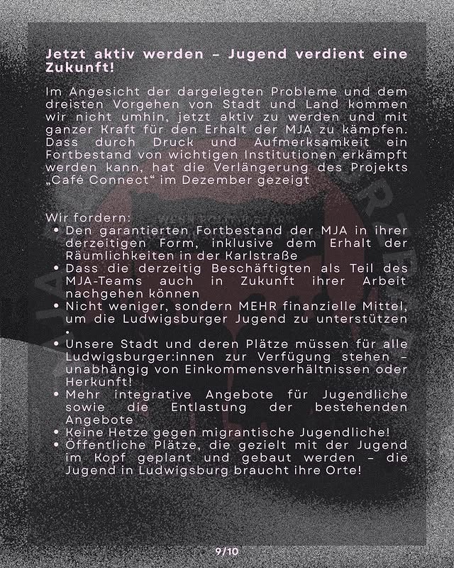 Die MJA war ein Anlaufpunkt und ein Unterstützungsangebot für Jugendliche. Ein Beispiel für Sozialarbeit, die vom ehrlichen Interesse geprägt war, den Jugendlichen im Alltag zu helfen, ihnen mit Respekt zu begegnen und die von den Jugendlichen hoch geschätzt wurde. Gerade von denjenigen, denen dieses System keine Perspektiven bietet, die sich allzu gut auskennen mit rassistischer Diskriminierung, Armut und Schikanen von Bullen und Behörden. Hinter der Schließung der MJA steht ein Sparkurs, der vom Bund, über die Länder und Landkreise bis zu den Kommunen durchgezogen wird.