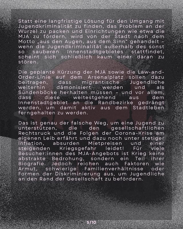 Ansätze wie die MJA, die sich wirklich für die Interessen von Jugendlichen und Anderen einsetzen, die unter die Räder dieses Systems geraten, werden in der kapitalistischen Krise zusammengekürzt. Stattdessen setzen die Herrschenden verstärkt auf Repression: Migrantisch Jugendliche werden ganz offen zum Feindbild erklärt und der ohnehin rassistische Polizeiapparat gegen sie in Stellung gebracht. Es gibt einen Zusammenhang zwischen dem Abbau sozialer Leistungen und dem Aufbau des Polizei- und Überwachungsstaates!